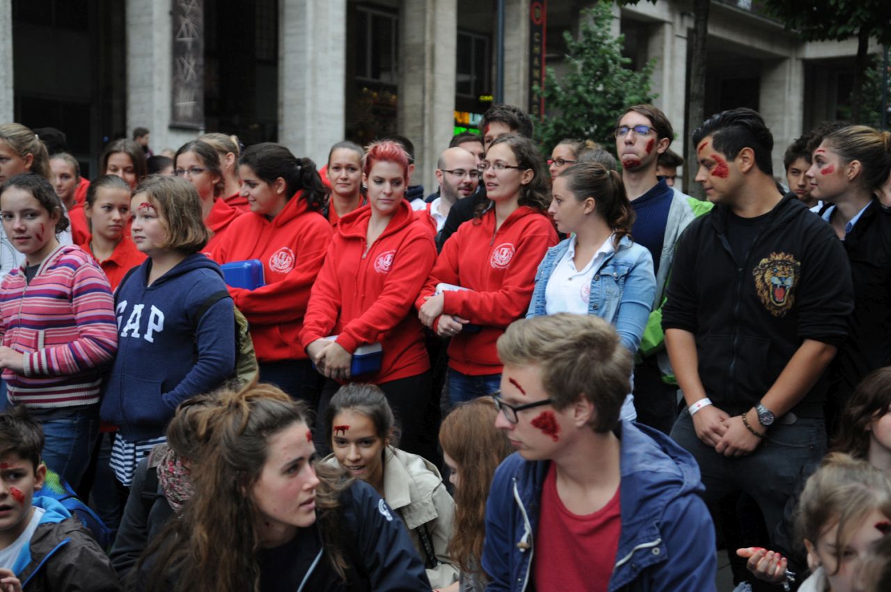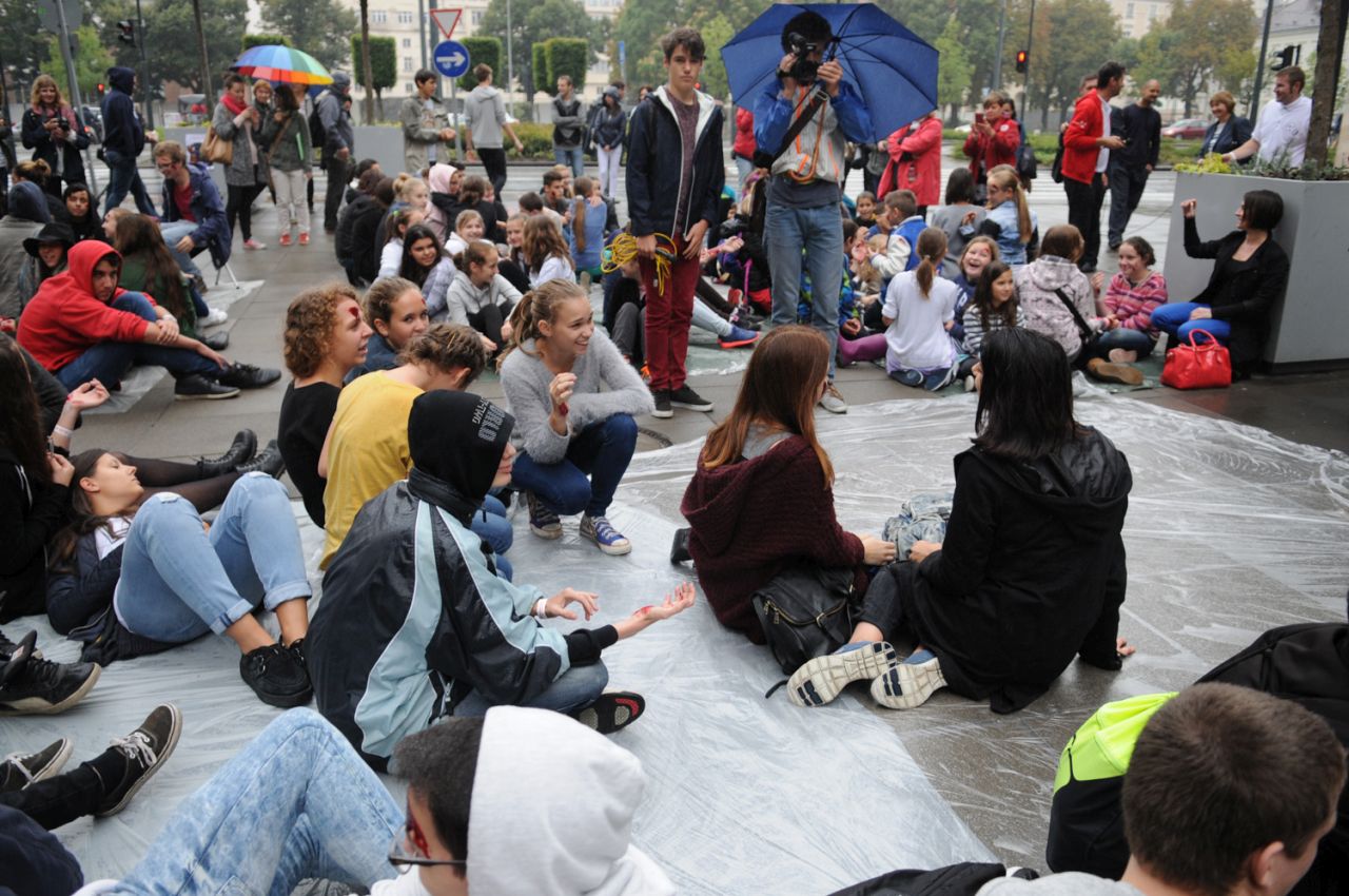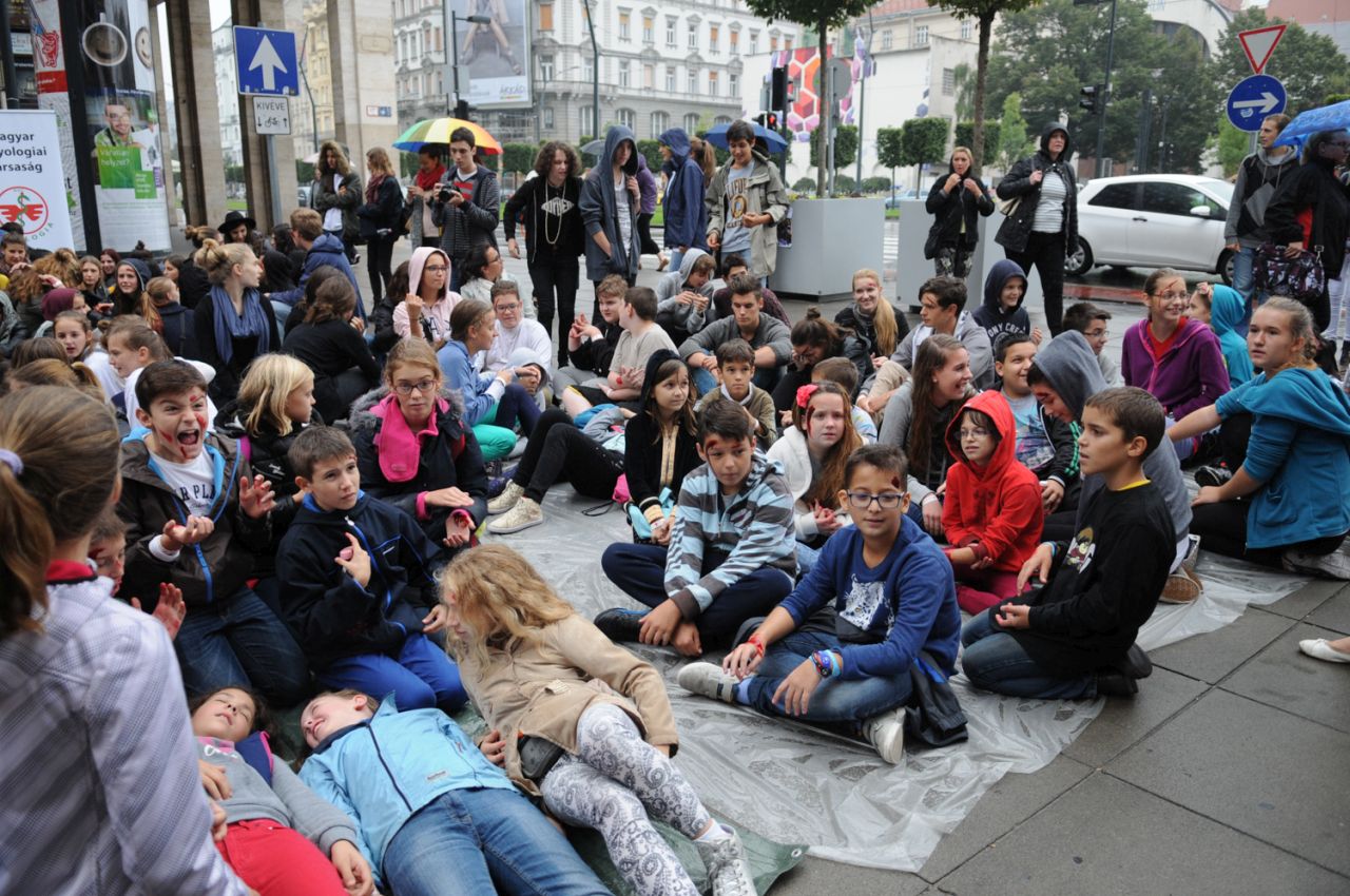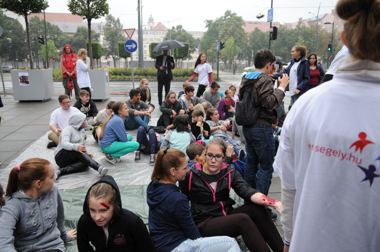 Baleset-szimulációs performance a Madách Imre téren, az Elsősegélynyújtás világnapja alkalmából.